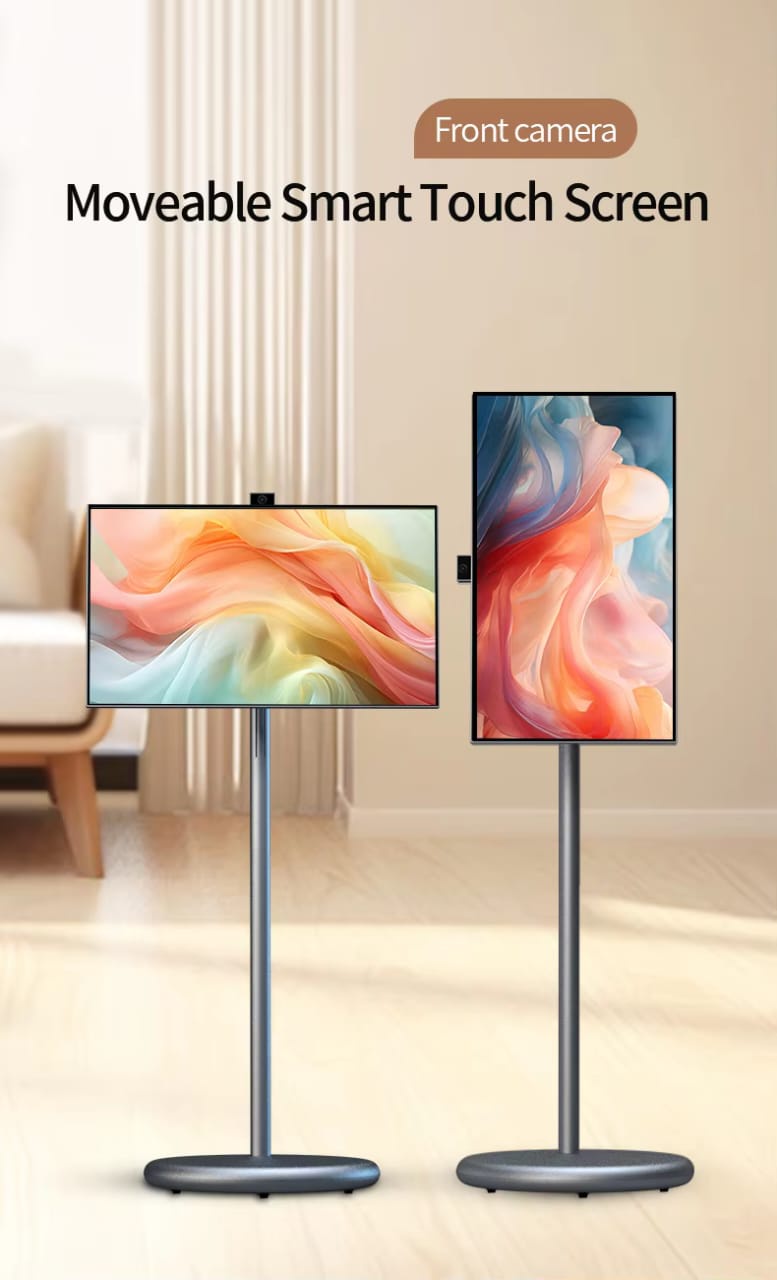 27-inch stand screen with camera and 128GB memory — Full HD panel, wide viewing angles, built-in camera for meetings, local storage for media/apps, mobile floor stand for easy placement at home/office.